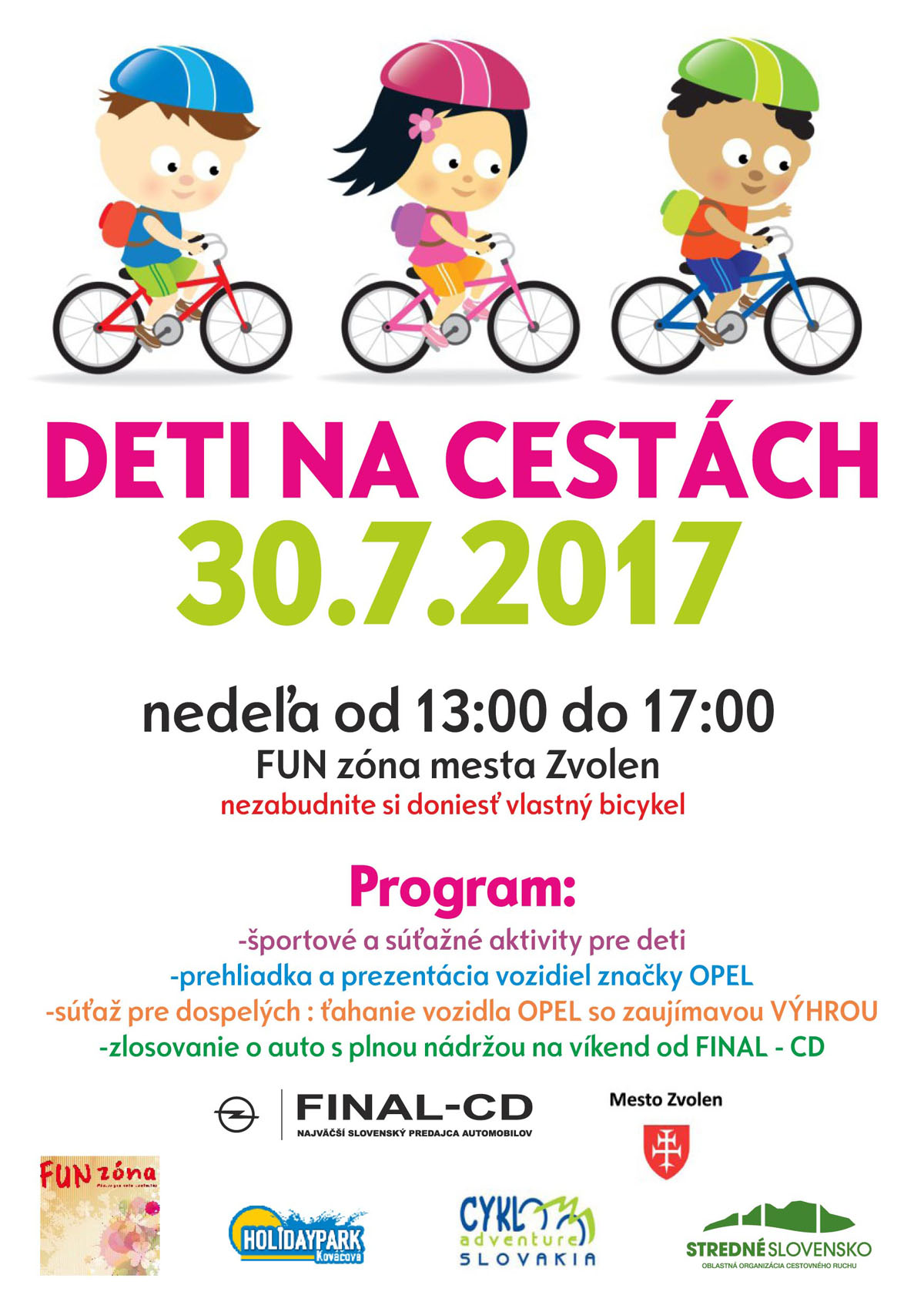 V nedeľu 30.7.2017 sme sa spolu stretli v meste Zvolen na námestí, kde si detičky mohli vyskúšať jazdu zručnosti na bicykloch a získali kopu nových informácií o správnej jazde.