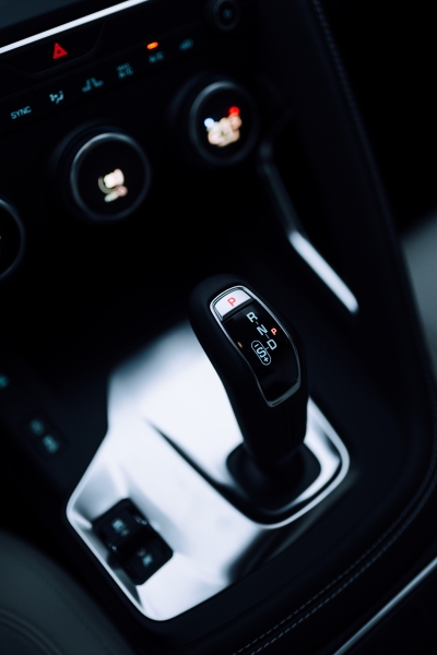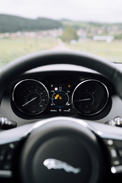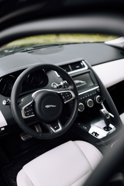 Z modelu F-TYPE v interiéri nájdeme napríklad volant, či volič automatickej prevodovky.